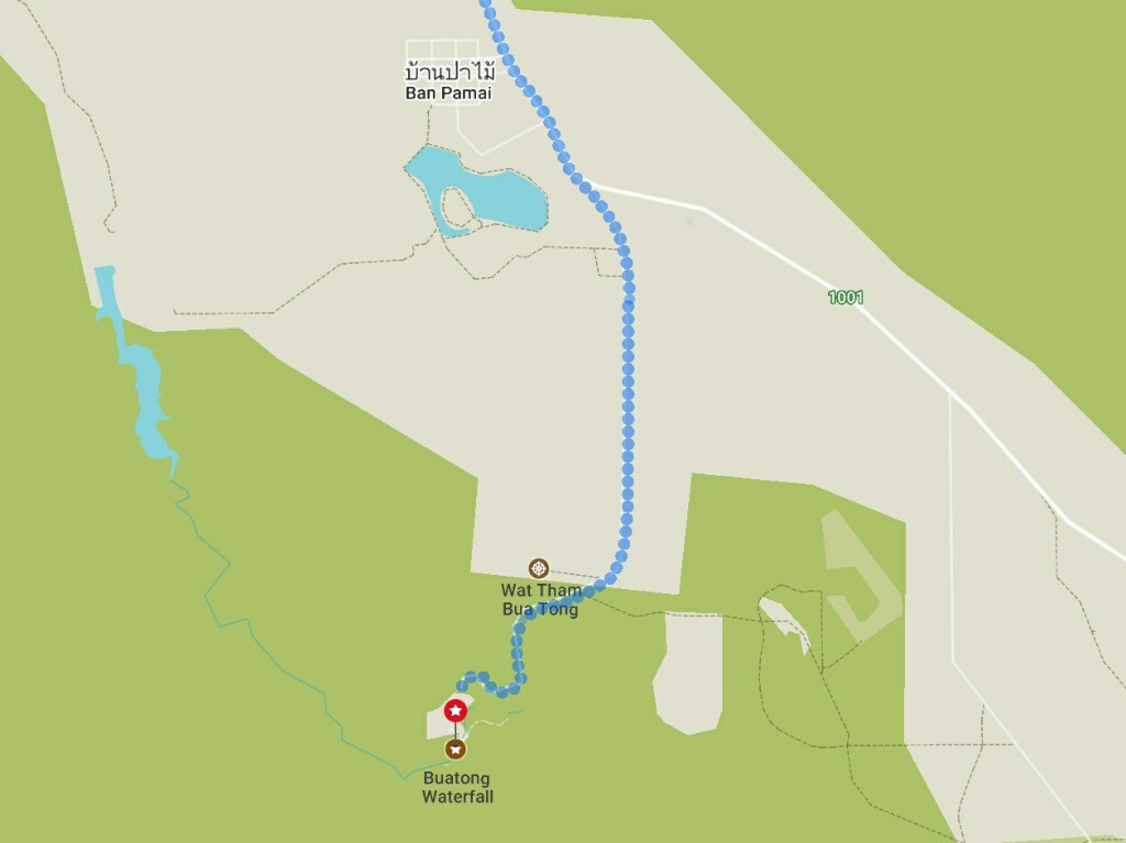 The directions are quite straight forward. Just get to the main road 1001 towards Phrao and follow it for about 50 kilometres. Then you arrive to the Y-crossroads. Not very clearly visible sign shows the way right to Buatong.
