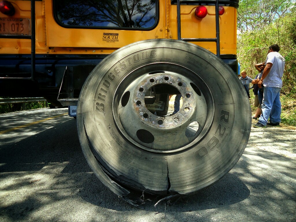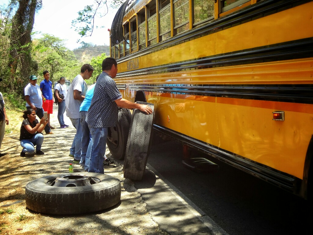 Z videnim še nisva bila zadovoljna. Zdaj, ko sva prišla na okus, kakšna čudesa skriva Nikaragva, sva hotela videti vsa. Tako sva nepričakovano naletela na dodatno dogodivščino na kurjem avtobusu. In sicer, eksplozijo pnevmatike med vožnjo. Pok je bil tako močan, da sem najprej pomislil na strel pištole. Hiter pregled je pokazal dejanski vzrok, a voznik se je odločil, da lahko nadaljujemo. Šele po dobrih desetih minutah premikanja s 15 km/h, je ugotovil, da tako ne bo šlo. Na srečo je bilo rezervno kolo hitro pri roki.