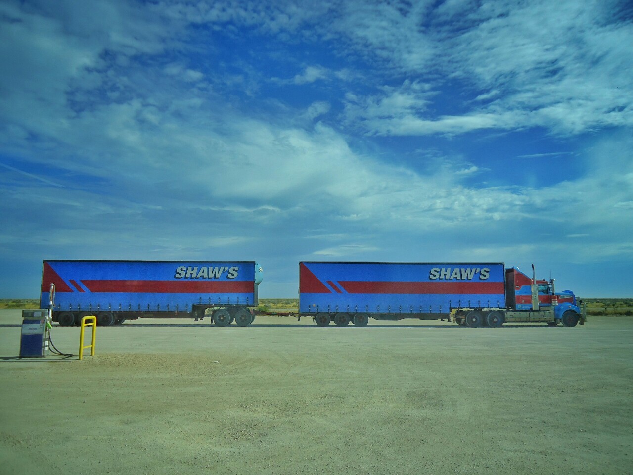 Druga stvar, ki sva jo srečevala, pa so cestni vlaki (dobesedni prevod iz angleškega izraza: Road Train.) To so tovornjaki, ki za seboj vlečejo več prikolic. Večina je takšnih, z dvema. Najdejo se s tremi. Zakonsko pa je dovoljeno vleči do vključno pet priklopnikov. Takemu tovornjaku si ne želiš vzeti prednosti!