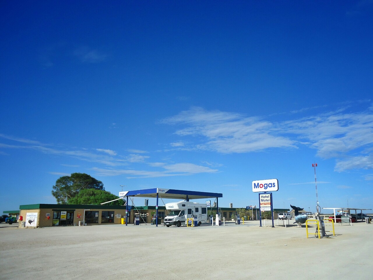 V avtodomu sva imala navigacijsko napravo GPS. Pobrskala sva po zemljevidu in opazila mesto, čez 200 km. "Ok, super," si misliva, "očitno, puščava vendarle ni popolnoma prazna." No, čez 200 km ugotoviva, da to velemesto ni drugega, kot črpalka, motel in letališče (pazljivo oko na sliki spodaj levo v daljavi zazna letališče s tremi vzletnimi stezami.) Takšna in podobna so bila edina mesta, ki sva jih srečevala v naslednjih dneh. Aja, nekatera so imela še igrišče za golf. Še vedno nisem prepričan čemu služijo. Ljudje so nama povedali, da golf sploh ni priljubljen. Le prostora imajo ogromno... :)