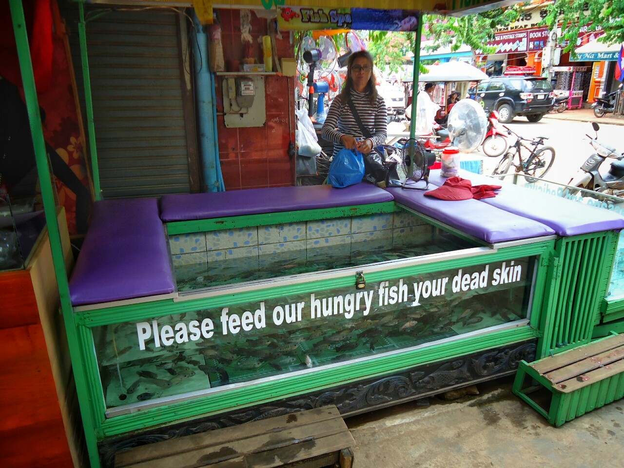 Še ena stvar, ki jo po malem videvava že nekaj časa, v Siem Reapu pa zelo pogosto. To so ulični pedikurni saloni (spodaj levo.) Posebni so zato, ker delo opravijo ribice. Nekako nisva zaupala v tukajšnje higienske standarde, zato žal ne moreva deliti praktičnega mnenja o rezultatih storitev :)