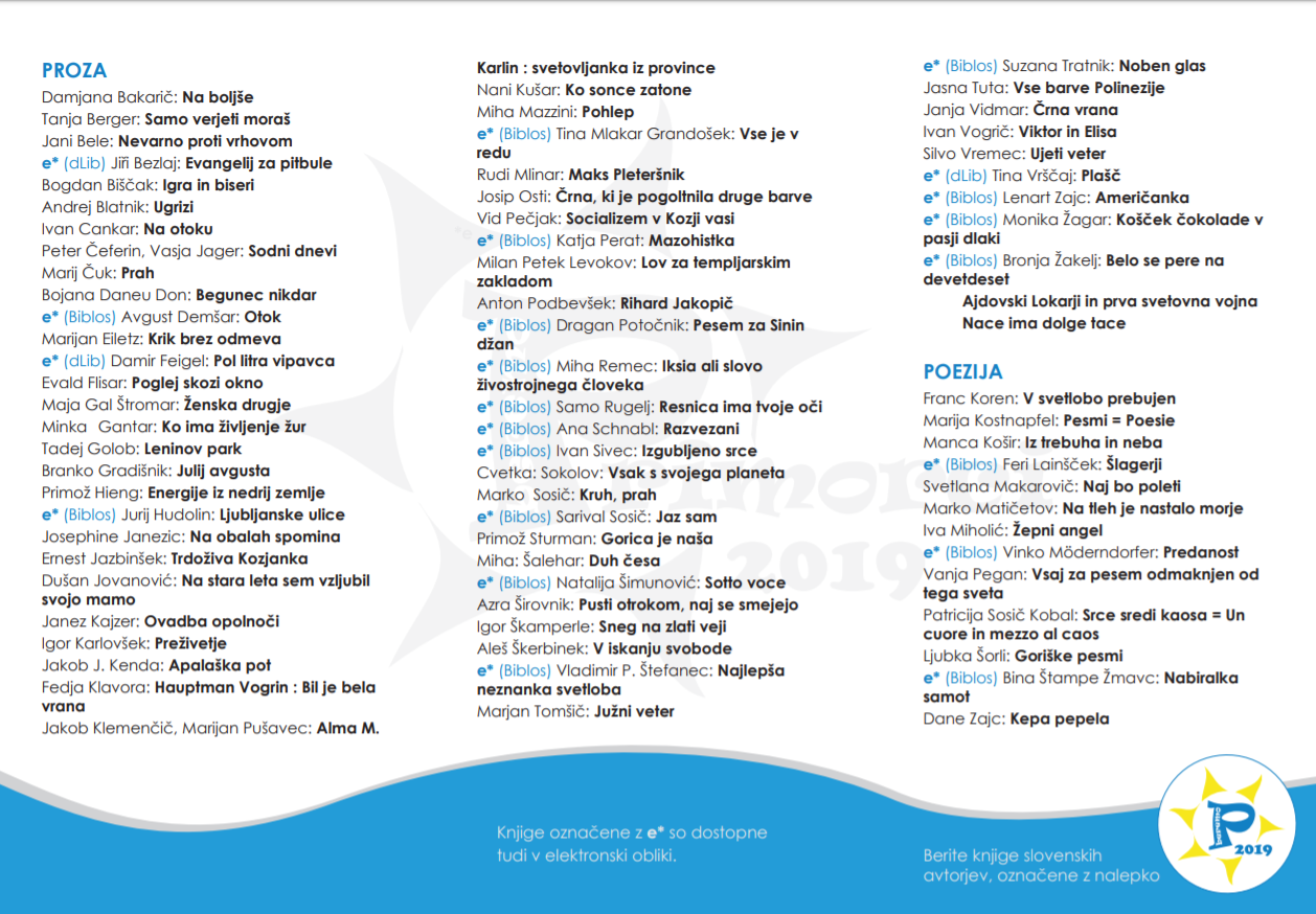 Primorske knjižnice smo na Svetovni Dan in Noč knjige, 23. aprila trinajsto leto zapored ponudile v branje nov izbor slovenskega leposlovja, ki bo bralcem vse do novembra omogočal bralne poslastice domačih piscev. Skupen bralni projekt primorskih knjižnic spodbuja branje izključno slovenskega leposlovja in utrjuje občutek pripadnosti kulturnemu prostoru, hkrati potrjuje, da se branje domačih avtorjev uspešno postavlja ob bok tujim.
